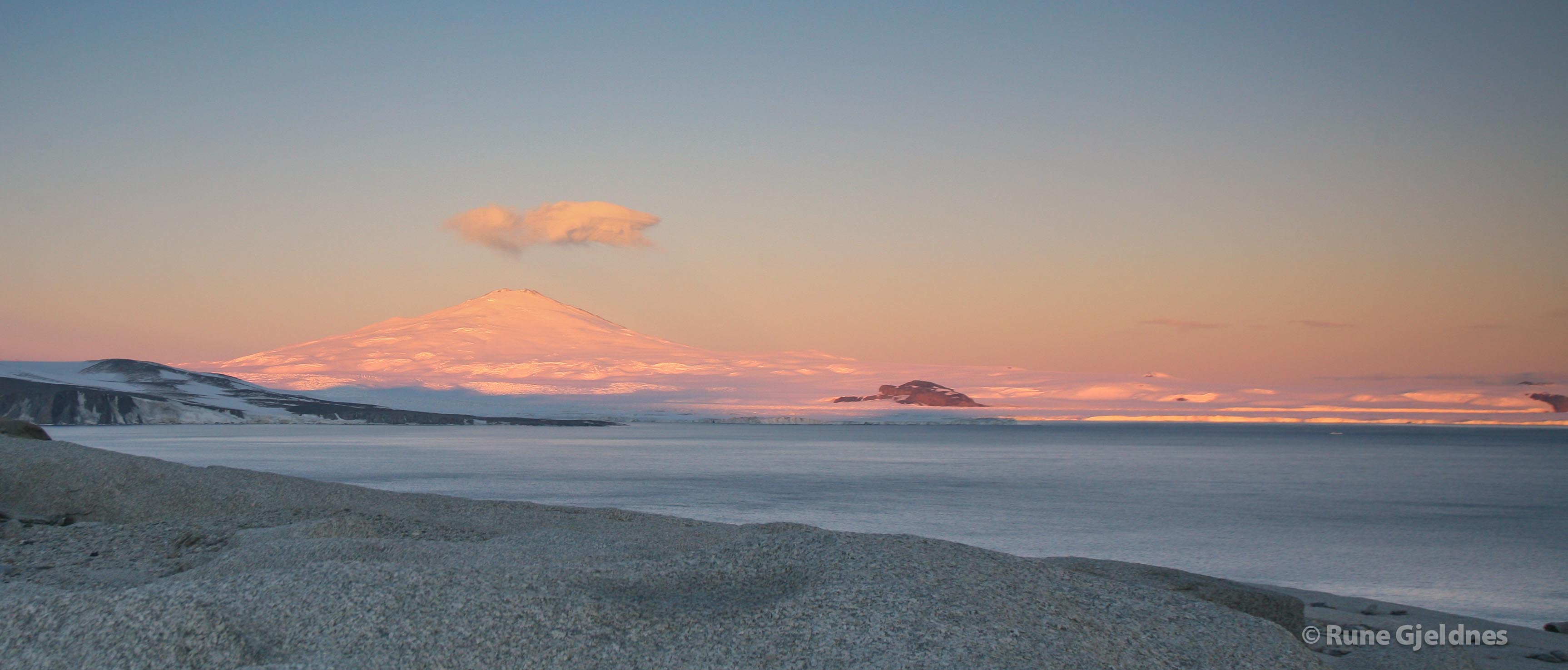 I was thrilled with more than the ocean and the icebergs. Far to the north I could see Cape Washington, a distinctly black mountain peak rising up from the ocean. I can also see the Campbell Glacier, a glacier snout reaching eight to ten kilometres out in the ocean and is easily spotted on maps and satellite photos. But what really caught my eye was the 2732 meters high volcano Mt. Melbourne.