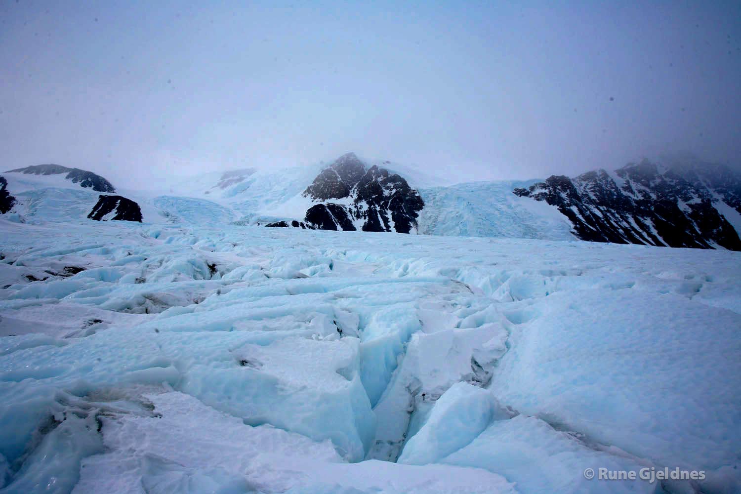 It’s been a strenuous day with a lot of uphill. I’ve been crossing the mountainsides on rock-hard crust and blue ice. Polar Storm has been struggling to get sideways down to the drops and has upturned several times. From time to time it has been very steep and I’ve been carrying my heart in my throat. One mistake, and man and his sledge could tumble over the edge of the drop.