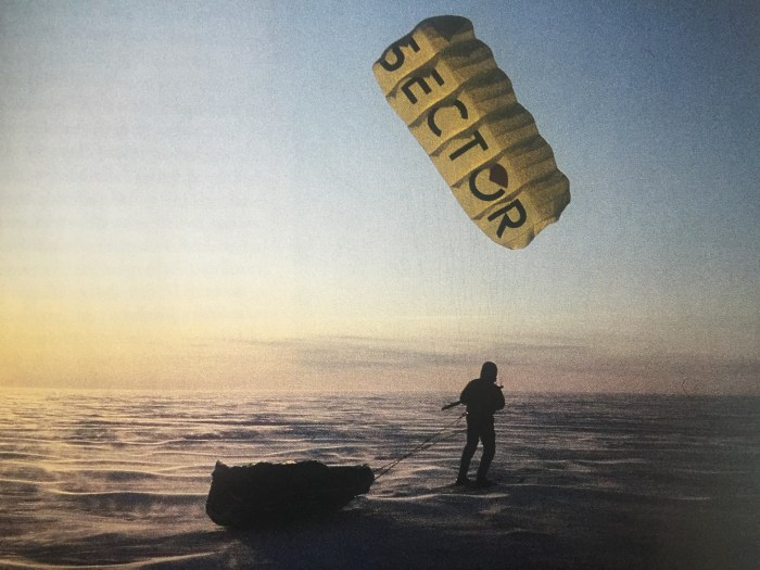 The right wind came on the right latitude. At that time we had the first versions of the skisails, and we had Sjur Mørdres polar skiboots, whiteout support, but they where warm. On ordinary Back Country skies and Mørdres Alfa boots, we had a record length of 175 km in a 24 hours sailing. It hurt. IT REALLY HURT! But, we saved energy and got further North. Today, this wind system is well known, and used by many kiters. The western side of Greenland is the world best place to do good skisailing.