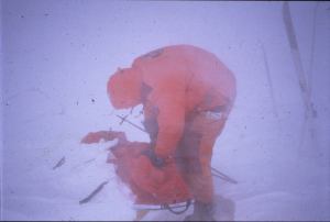 - Blizzard and out checking the sled and tent.
