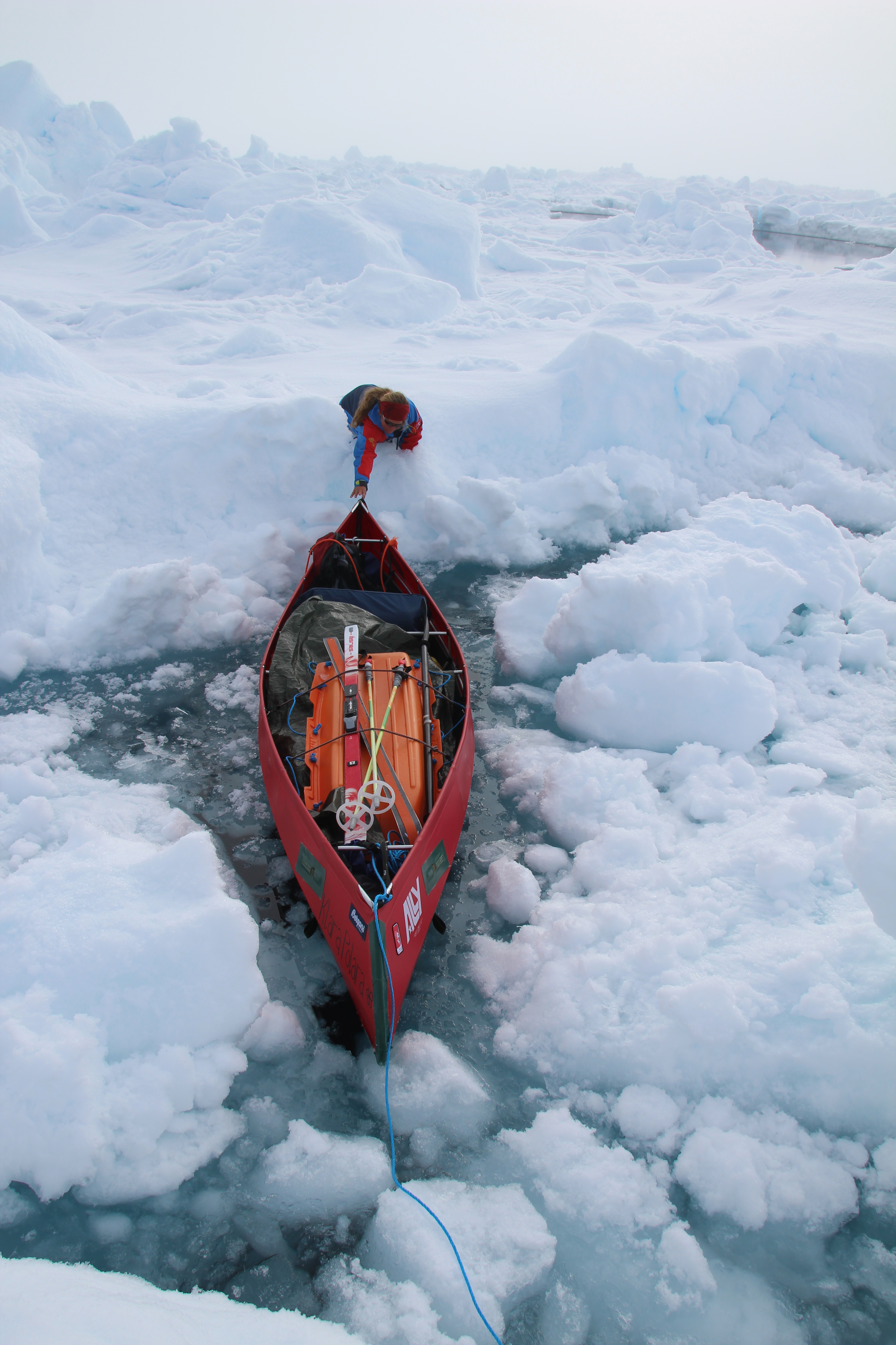 Day 6 on the ocean. Nice and sunny day up here. 3,4 C this morning. Which means wet snow and loose snow. Best day so fare, but still not good distances. Quite lot of lead systems. Not big once but we have to do lots of scouting to find a possible route through the labyrinth. One lead we could canoe. The routine is that I help Cecilie out and she takes me in. Well a good day on the Arctic Ocean today.